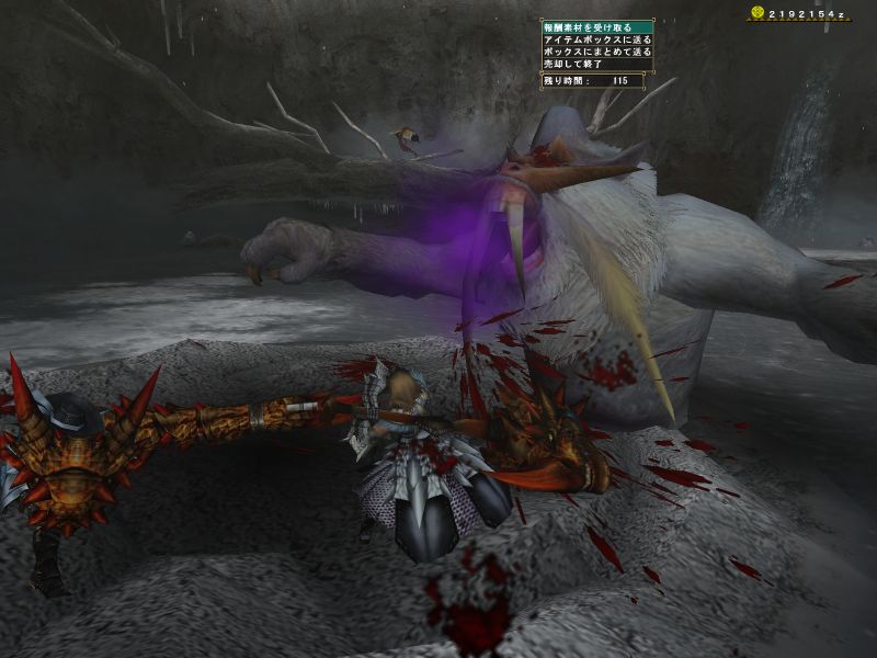 そんなに強くないティガが2頭とラーが2頭、ラーの尻尾切っちゃだめでどちらかが捕獲というクエだけど、今まで成功したことが無かったw