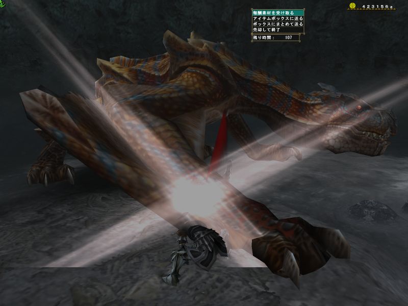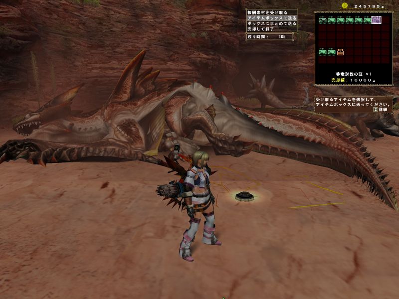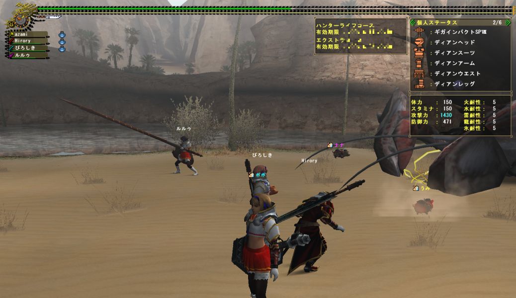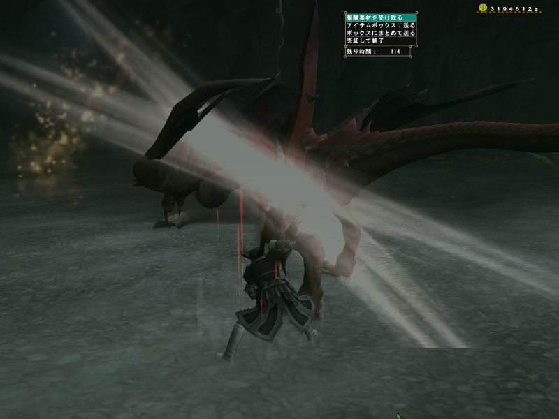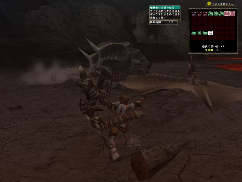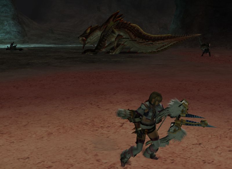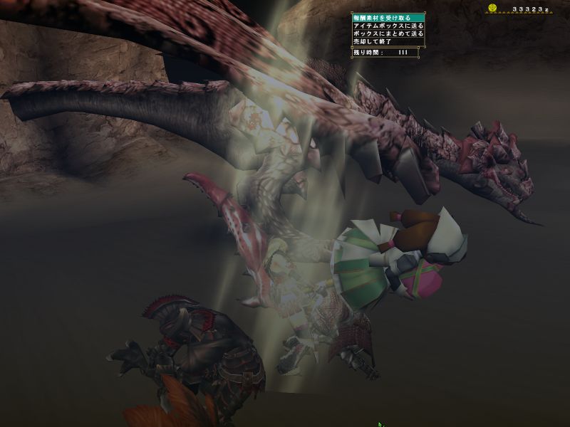 上位ラオと同じような構成のPTで出かけるがエリア1の階段や橋の上でサブターゲット(龍薬石堀り)をしようと待っていたら、ラオの体当たりで4人全員が死亡。。。キョトーン