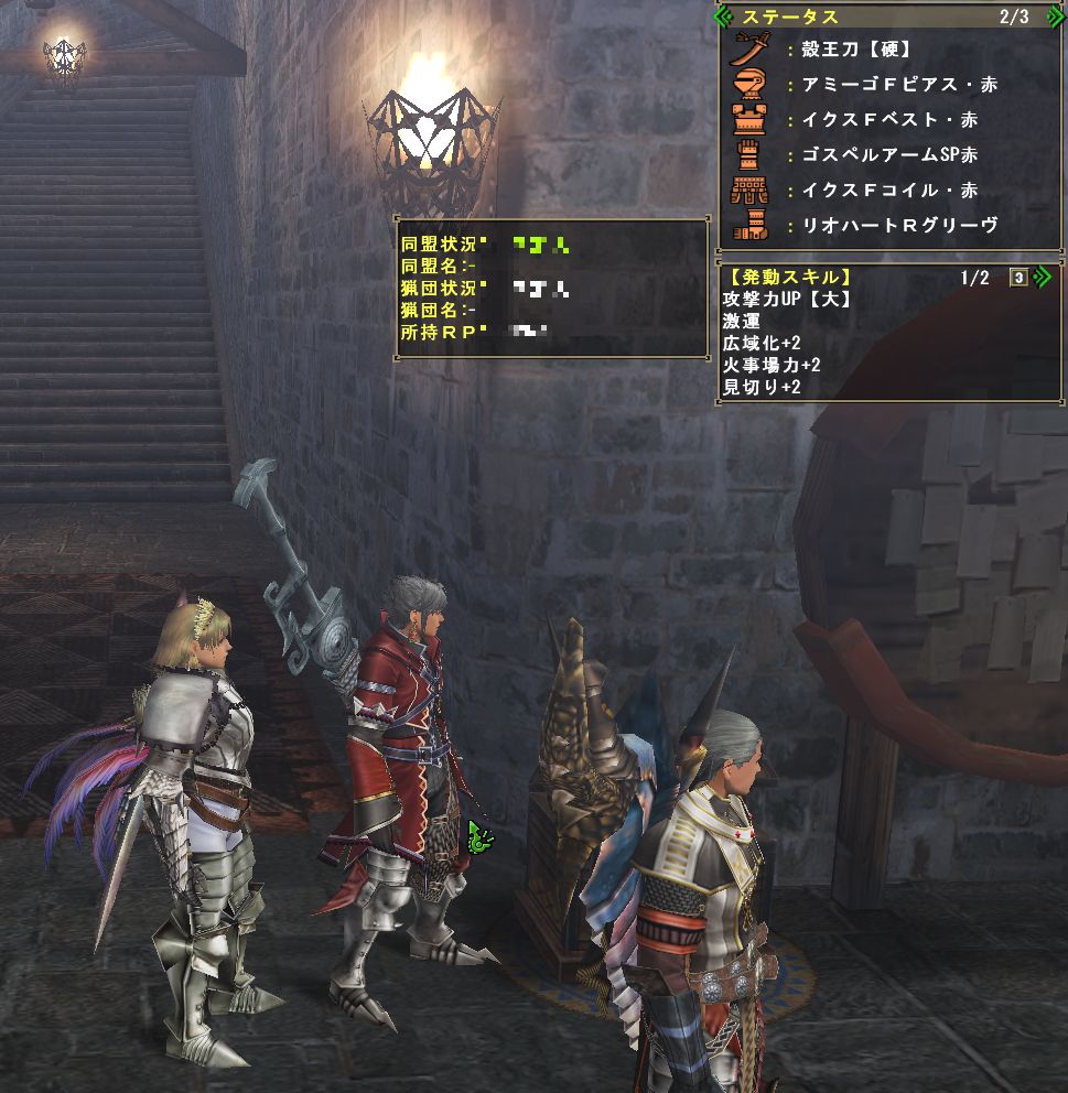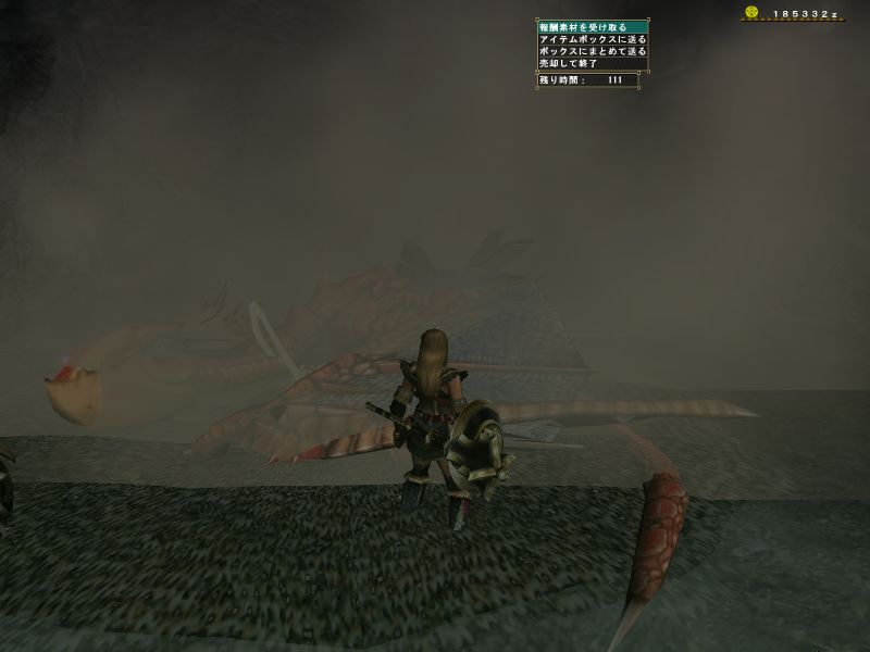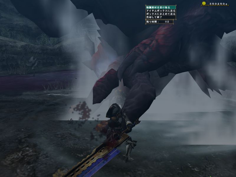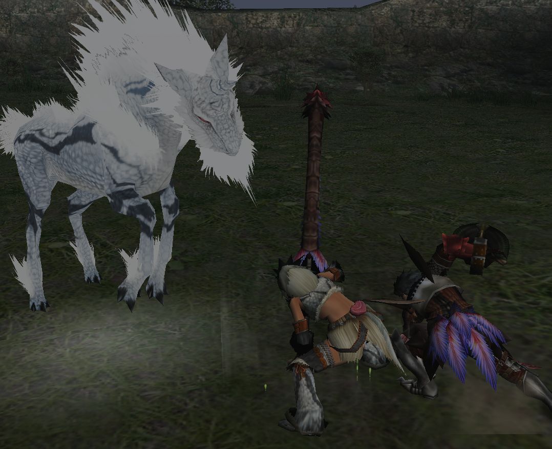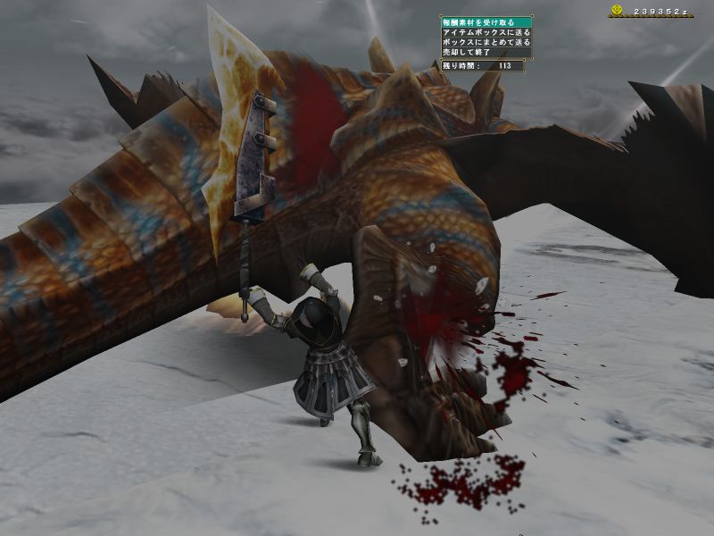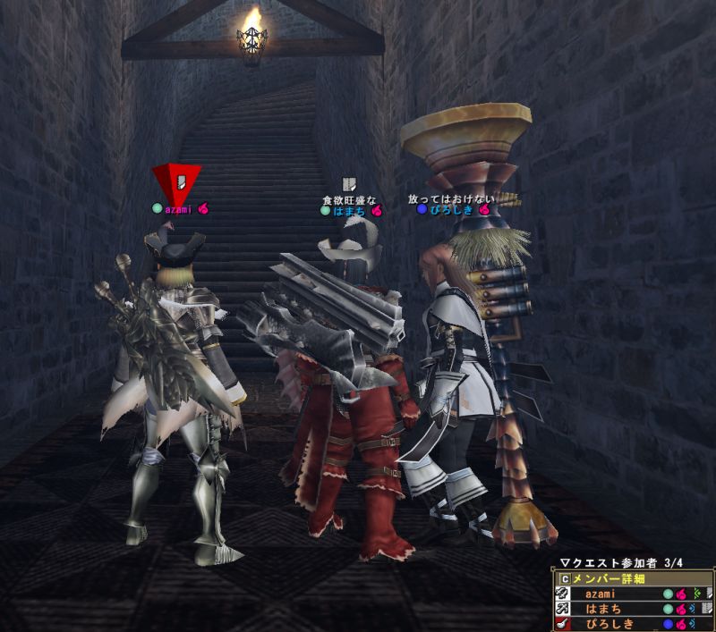 上位ラオと同じような構成のPTで出かけるがエリア1の階段や橋の上でサブターゲット(龍薬石堀り)をしようと待っていたら、ラオの体当たりで4人全員が死亡。。。キョトーン