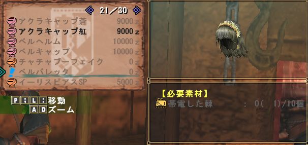 去年のアクラバレッタのように頭防具「ベルバレッタ」が生産可能になる「帯電した棘」というのが試練2で手に入るもよう。