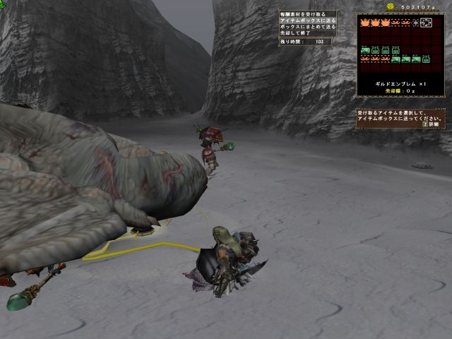 サブがギルドフラッグを立てるのと氷結晶1個の納品。サブを達成すると罠と捕獲ナイフがBOXに届く仕組みだ。