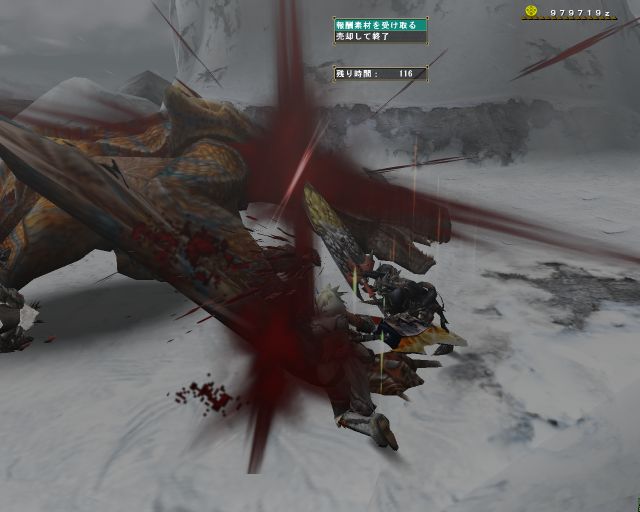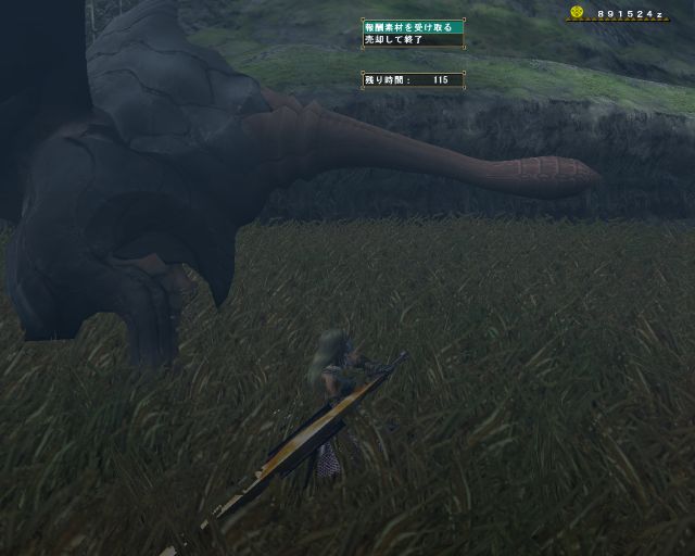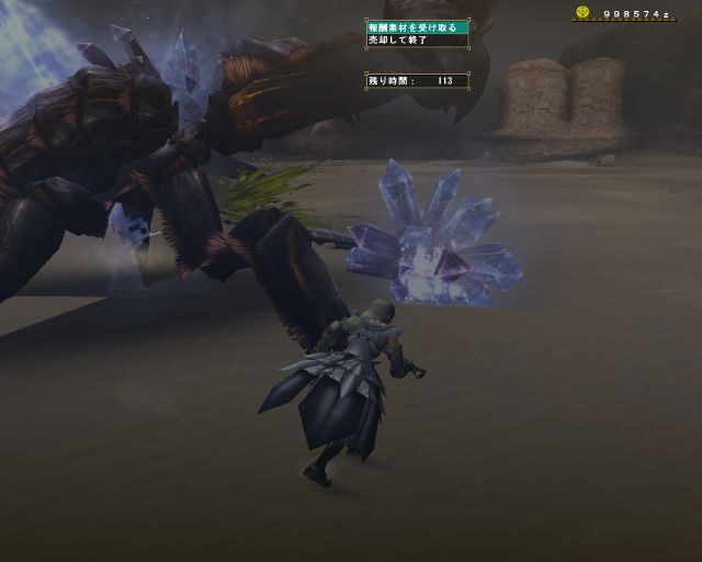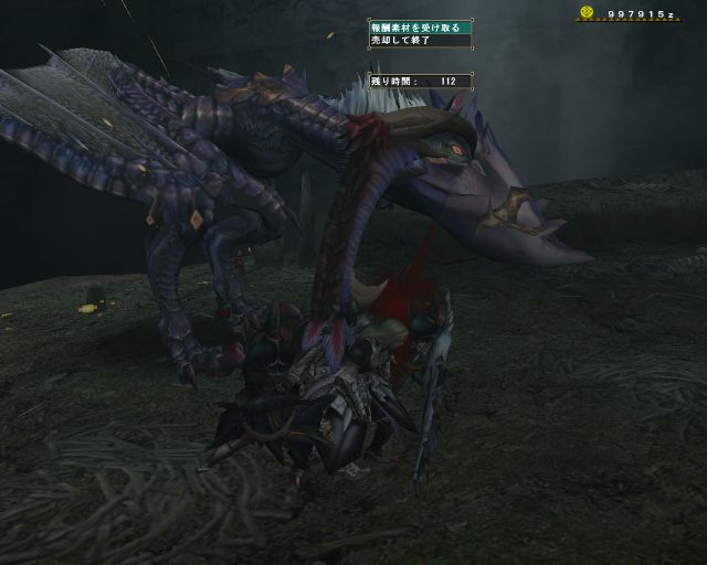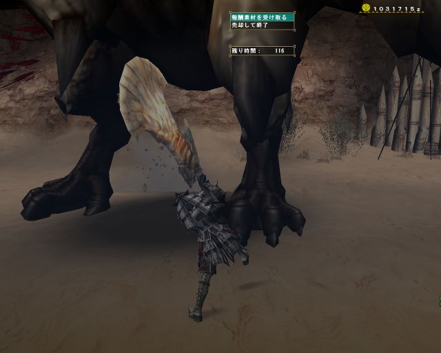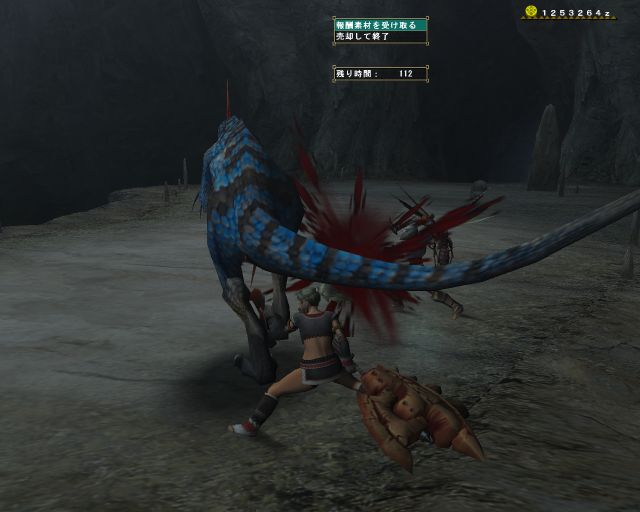 ギャラリー大会で手に入れようとして5000000z(ごひゃくまんぜにー)はつぎ込みそれでもGETできなかったというWIIさんと行ってみました。先日の一周年記念のエスピナスを狩るとレアな素材がざくざくなクエでも、WIIさんには出なかった「毒怪鳥の頭」ですが、このクエでは「2個きた」ということだったので、ゲリョ頭欲しい人は行っておくのをお薦めです。