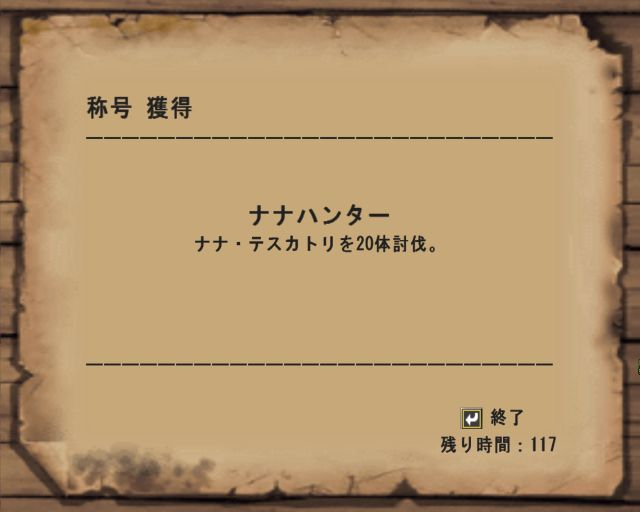もどってナナ討伐継続。これが20頭めのナナになって「ナナハンター」の称号。