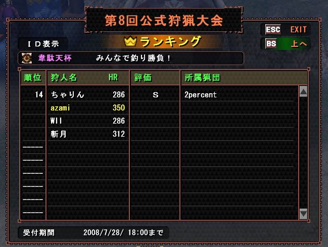 合併という形で入団してくれたはまちさんは、P2Gの発売とともに居なくなった元の団の人が結構復帰しているのと、もっとHRの低い人中心の団を新しく作るか探すために退団した。