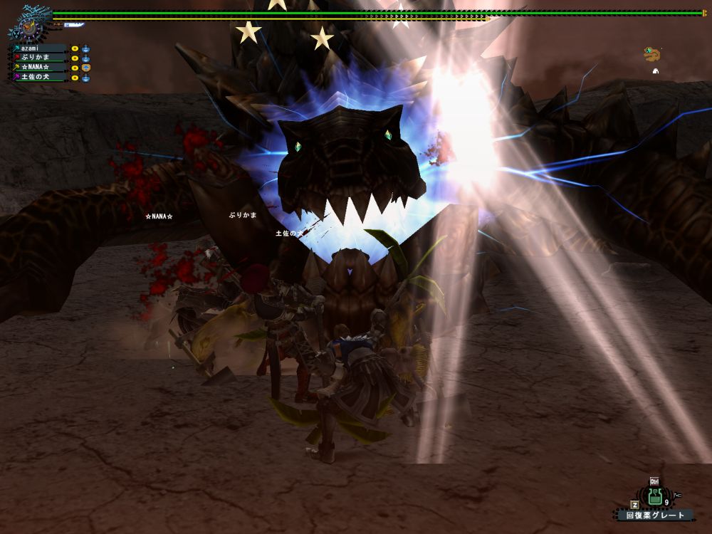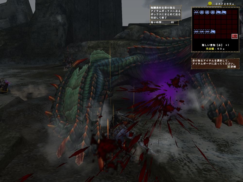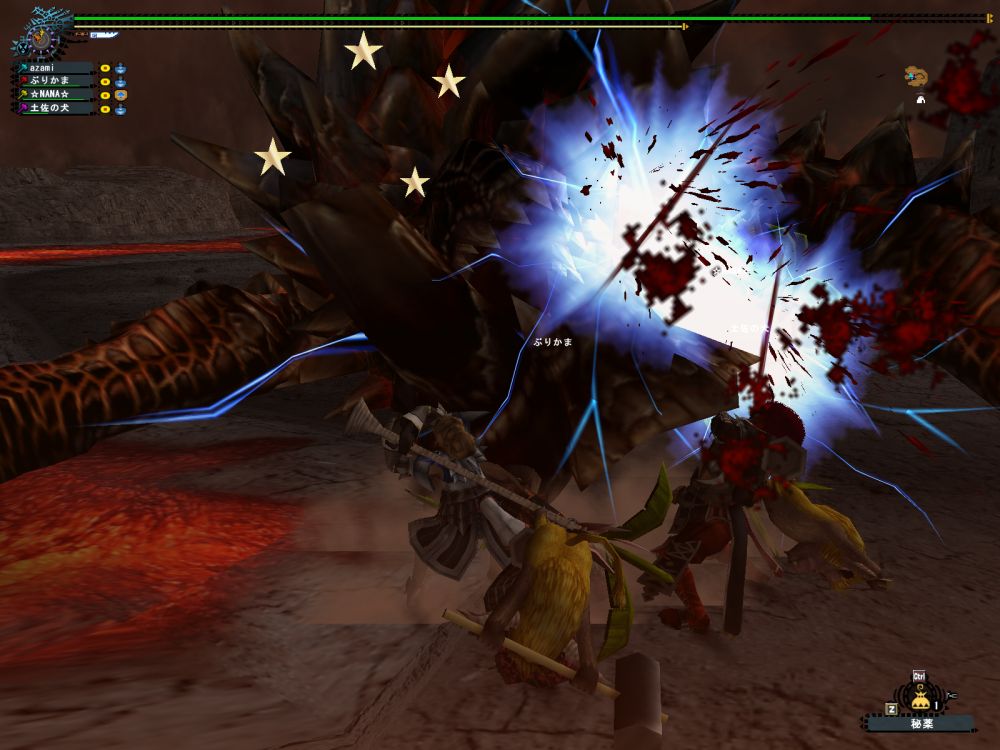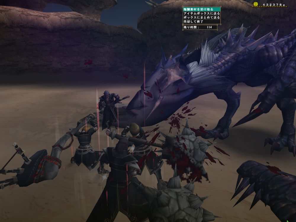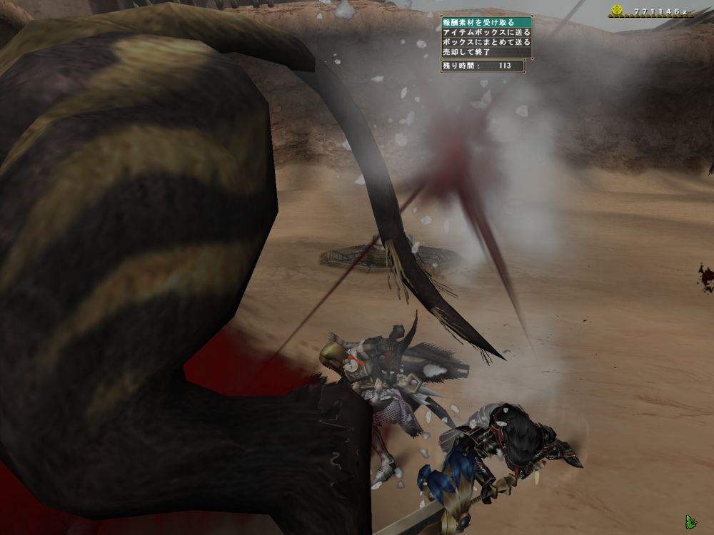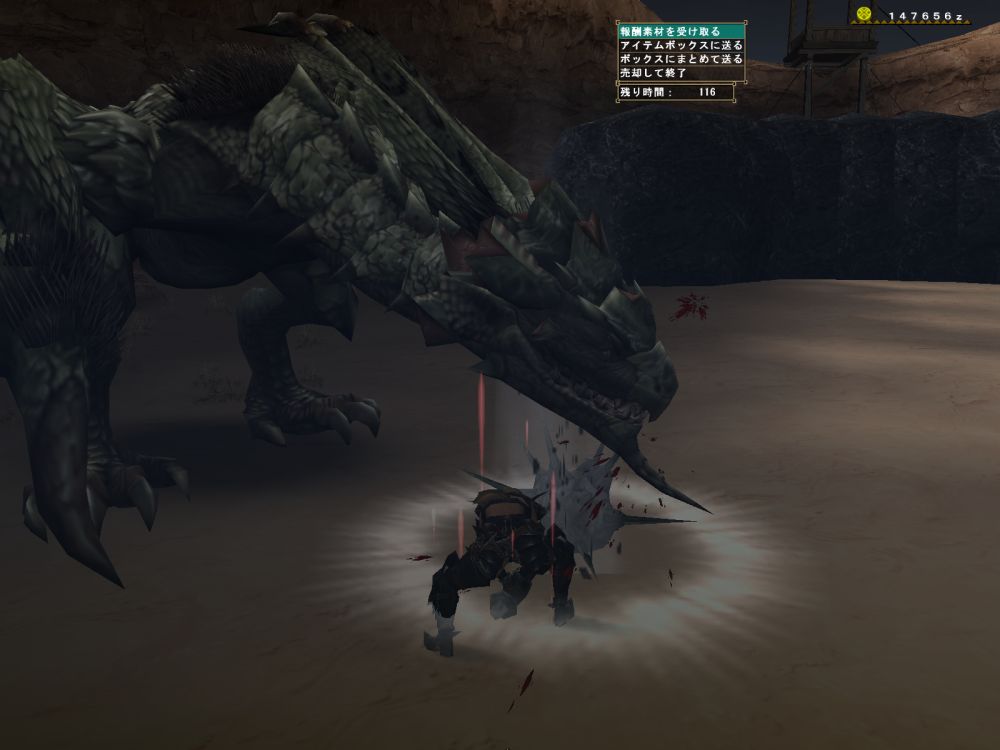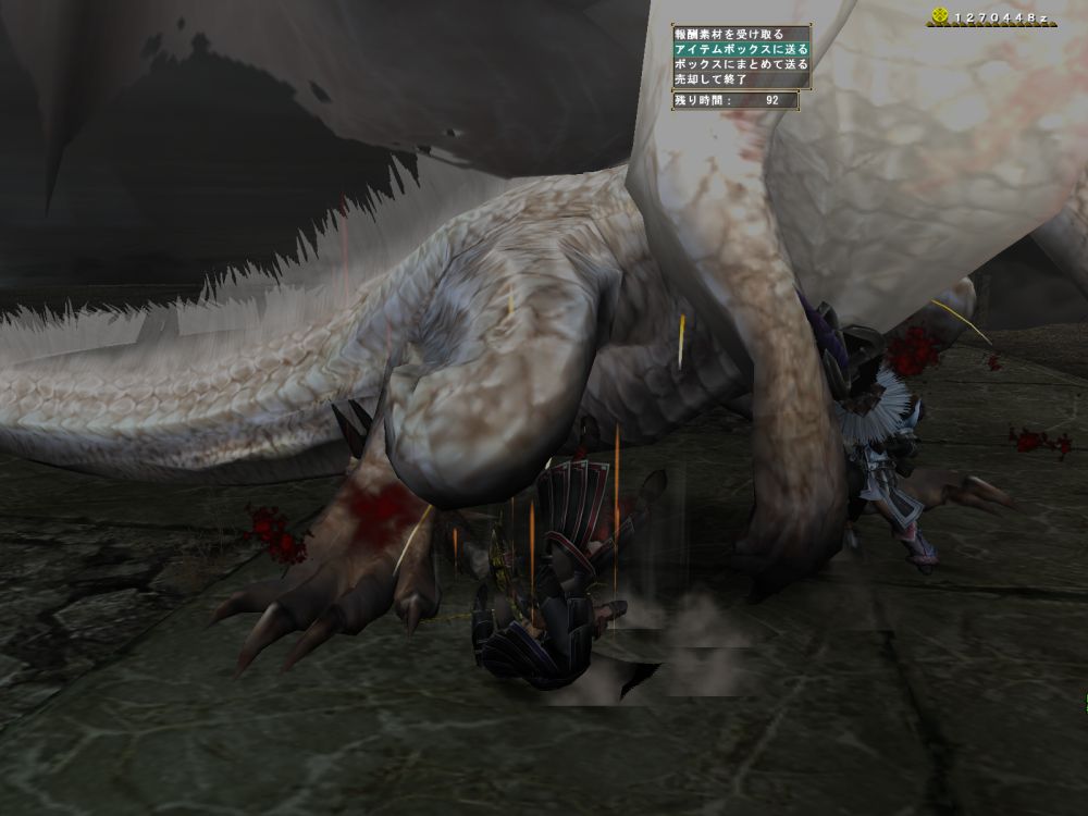 基本怒らせて角も背中も壊す。尻尾も切って2分という繰り返しだが、コゲ肉作りのせいで、2時間退屈しなかった。