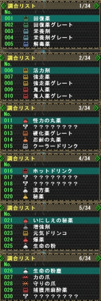 そのなかに例えば「秘薬」ならば、「ハチミツ+栄養剤+マンドラゴラ」と「栄養剤グレート+マンドラゴラ」と「回復薬+回復薬G+龍薬石」のように2種調合、3種調合あわせて3とおりといろいろな組み合わせがあるため総数は237にもなります。