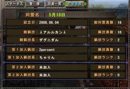 「猟団メニュー」には最後のタブにこういうふうに表示されます。同盟先の個々のプレイヤーの状況など細かいことはここからは知ることが出来ないようです。猟団チャットが直ちに有効になって(ヘンな色だけど)ちょっとびっくり。