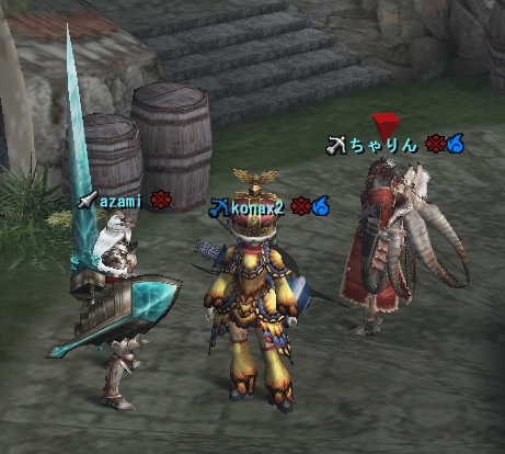 ロロちゃん火属性の大剣、わたしガンス、ちゃーさん片手、コナさん双剣だったかな?