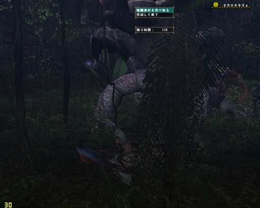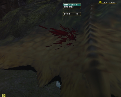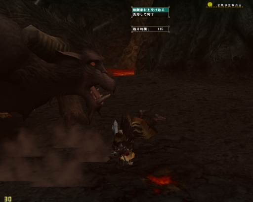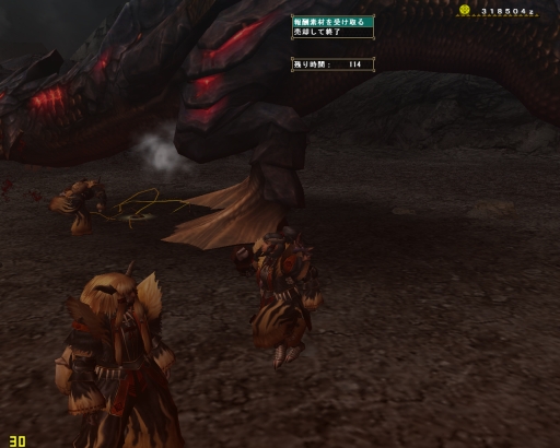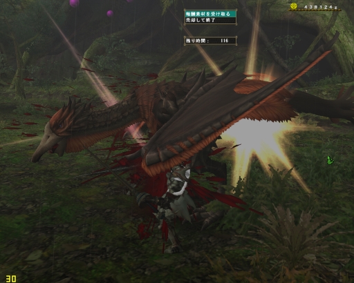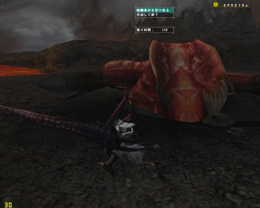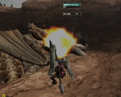 最初塔で角を壊し、尻尾を切ったところをガプに毒をぺっ!と吐かれてよろよろ、時間かかってもいいや~~と支給の爆弾とか並べて遊び半分してたらナナは「傷つき逃げ」帰ってしまって大ショック。逃げちゃうのかよー;;