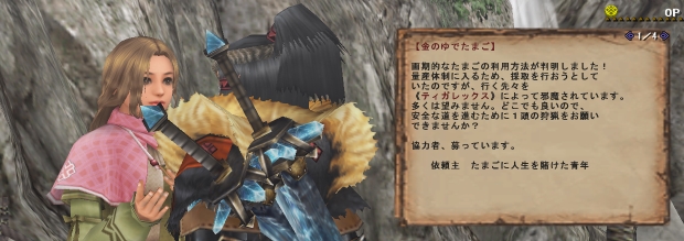 何日か前に銀レウスのクエから戻ってたまたま持ち合わせていた上鱗だか甲殻だかをあげたら、かわりに「金のゆでたまご」をもらった。そしてこのギルドからの依頼が追加された。要するに「贈り物」をして何か新しいアイテムをもらうとそのアイテムがまたもらえるようなクエが追加されるということかな。