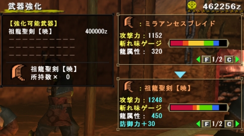 伝説の職人さんが来なくても、強化は出来る事に気づいてクエから戻るなり武器屋へ。祖龍聖剣【暁】のできあがり。素材的にはやはり虹色と案外黒龍の鱗が大変だったかも(一度ミラブレイド売り飛ばしていたのでww)