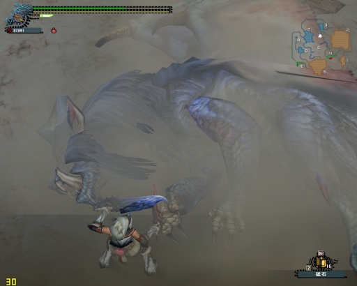 たいくつしたので、ヴォルを落とし穴にはめてハンマーで殴ってみる。2度スタンして星がくるくるまわっていたが、それが消えてからはずざざざざ~攻撃にやられて死亡。採取装備ではもたないね。
