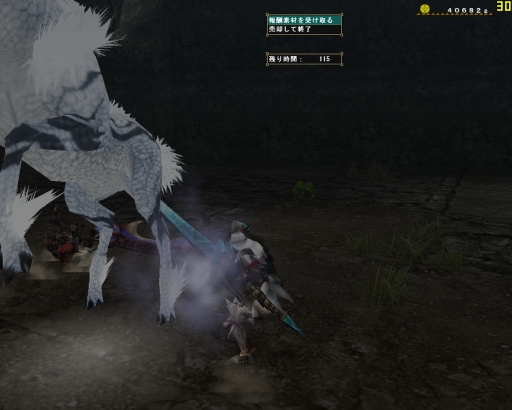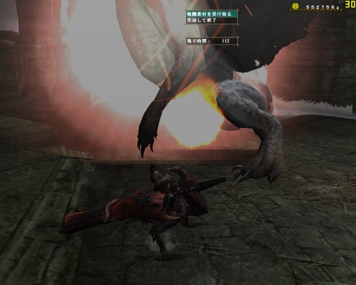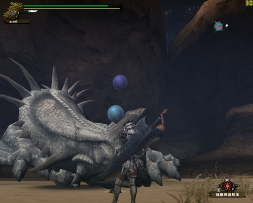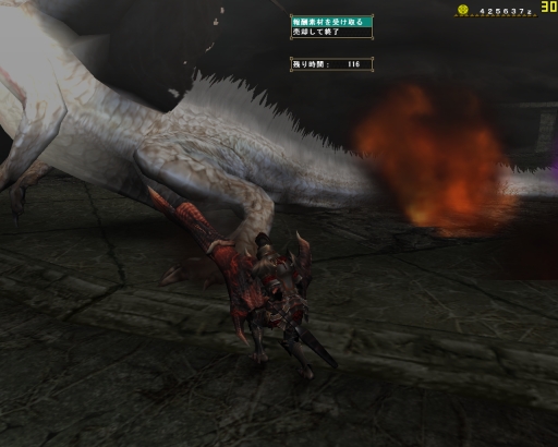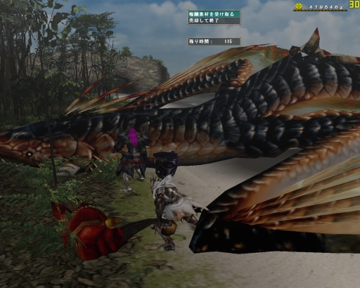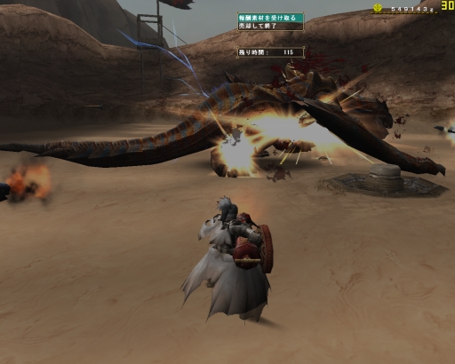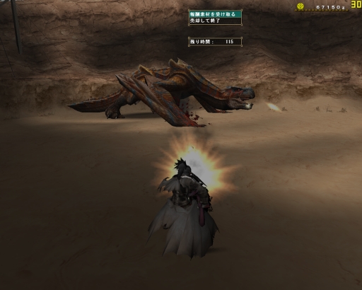 タメ3連射の大事さを教わって、はじめてちゃりんさんがグラを沈めるより早くバサを倒したゾ。いつもならあのドーナツのようなエリア7から6、4と移動するバサが、いきなり4へ移動したのも大きかったと思う、ガプラスがしつこく邪魔をする6で闘わなかったというのが。ガプラスが沸く場所ではわたしではまだ火事場は無理だ。蹴られるは、毒をくらうは、バサとの正しい距離も保てなくなっちゃうし。。。精進しなきゃです。この先にはグラビが待っているので。