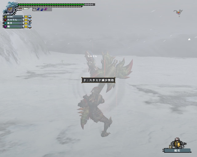全員が笛の場合、攻撃力UP大ー血笛斬月、風圧無効ーゴルトわたしのように役割を分担してあとはひたすら殴るに専念するといいですよね。あとはメロディ無視で前後右に笛を動かす動作で殴る、これも役立ちますね。